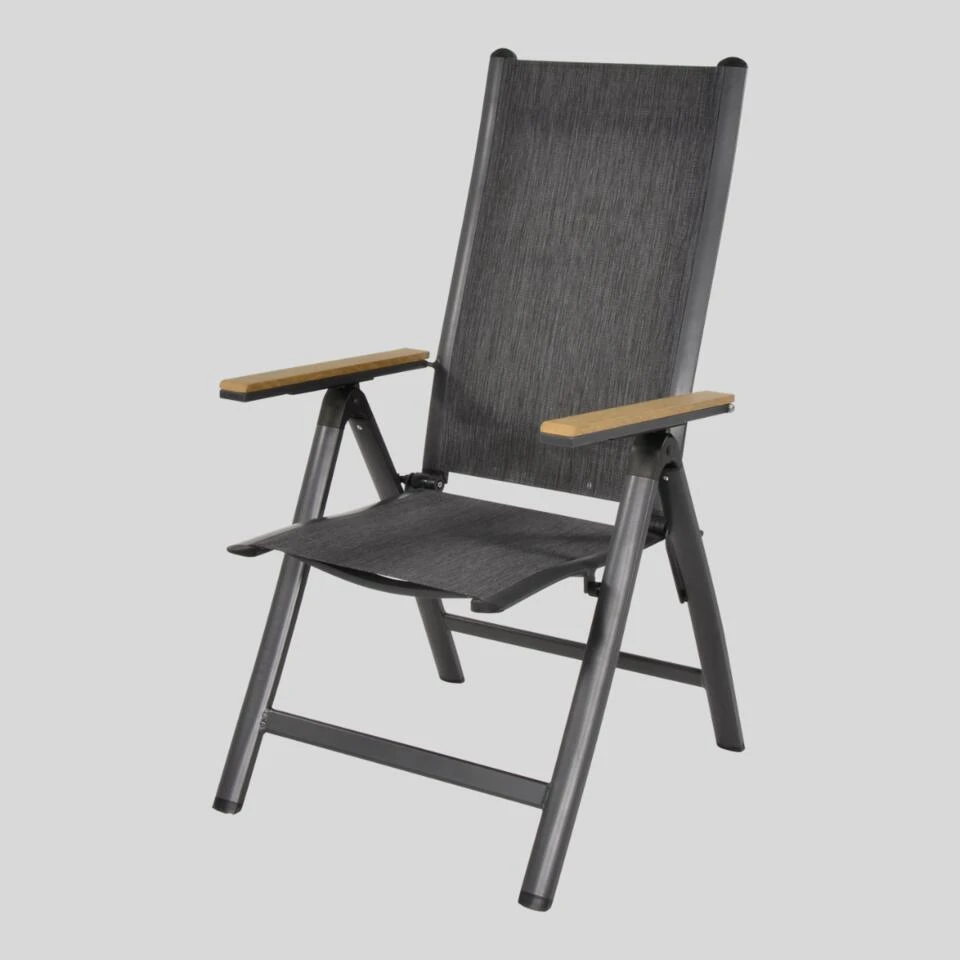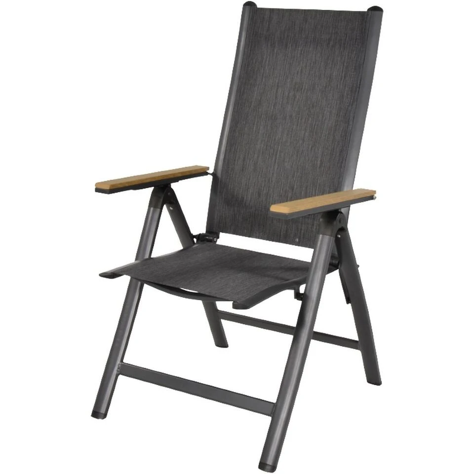 Standenstoel Arezzo heeft een tijdloos ontwerp, waardoor hij gemakkelijk bij veel verschillende stijlen past! Deze tuinstoel is uitgerust met een zitting en een hoge verstelbare rugleuning, welke beide gemaakt zijn van grijs textileen. Het onderstel bestaat uit vier donkergrijze aluminium poten. Tevens is deze stoel uitgerust met armleuningen, welke zijn afgewerkt met stijlvol polywood met een teakhouten look. Extra handig is dat deze stoelen inklapbaar zijn, waardoor ze gemakkelijk kunnen worden opgeborgen bij slechte weersomstandigheden. Combineer deze verstelbare tuinstoel ook eens met de bijpassende terrastafels en maak de set compleet. Afmetingen Totaal (BxDxH): 57x69x103 cm *Polywood is een 100% kunstmatig alternatief voor hout. Dit materiaal kan net als hout gaan werken, waardoor onregelmatigheden over de armleuningen niet te voorkomen zijn.