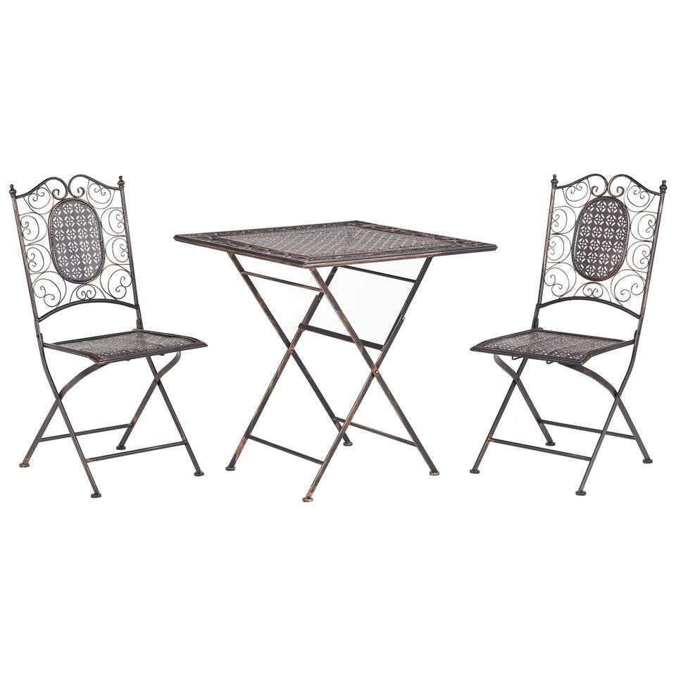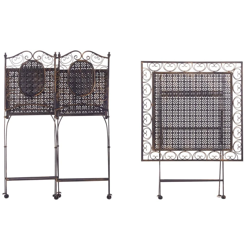 Inklapbaar balkonset voor 2 personen voor binnen of buiten. Breng wat romantische sfeer in huis en geniet van een ontbijt op je balkon met deze vintage-geïnspireerde set van twee stoelen en een tafel. De bistroset is gemaakt van hoogwaardig, gepoedercoat ijzer en zal je jarenlang van dienst zijn. Elk stuk kan worden opgevouwen voor eenvoudige opslag en kan gemakkelijk van de ene plaats naar de andere worden verplaatst. Dankzij de unieke ornamenten, het opengewerkte ontwerp en de verweerde afwerking, staat dit bistroset charmant in elke buiten of binnenomgeving.