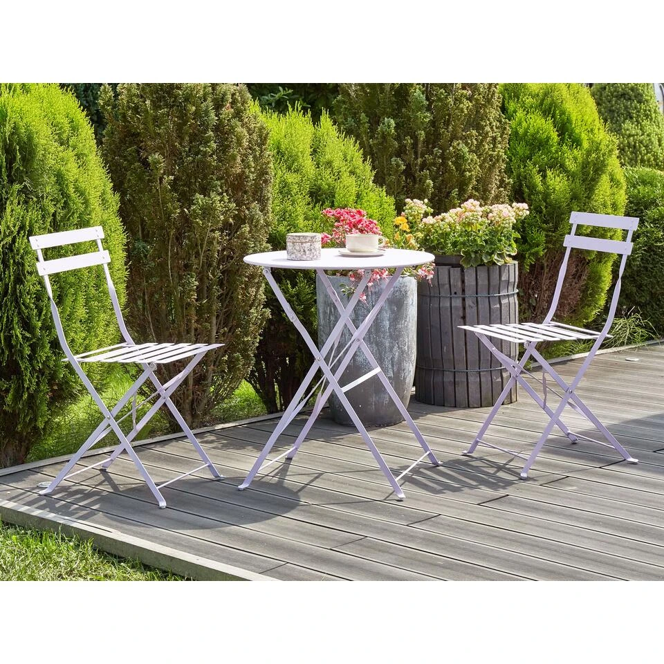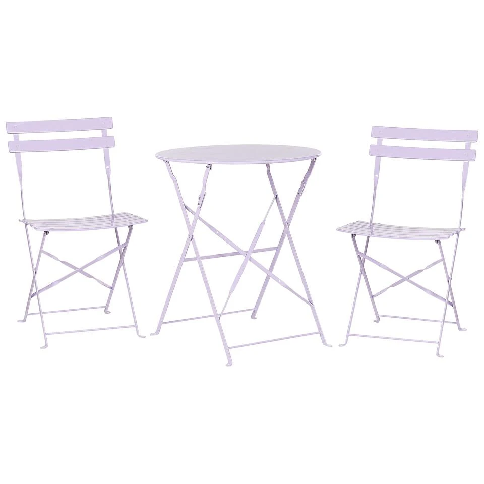 Balkonset met 2 stoelen. Deze veelzijdige set, bestaande uit twee paarse stoelen gecombineerd met een functionele terrastafel, is perfect voor een terras of balkon met elk ontwerpschema. Alle elementen zijn licht en vouwbaar zodat deze makkelijk kunnen worden opgeborgen. De hoogwaardige, ongelegeerde stalen constructie maakt langdurig gebruik buitenshuis mogelijk. Deze charmante bistroset is perfect om dat plekje in je balkon of terras te creëren waar je kunt ontspannen. Geniet van je drankje en pak wat zonnestralen.