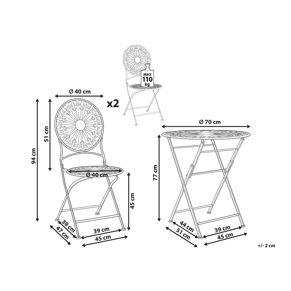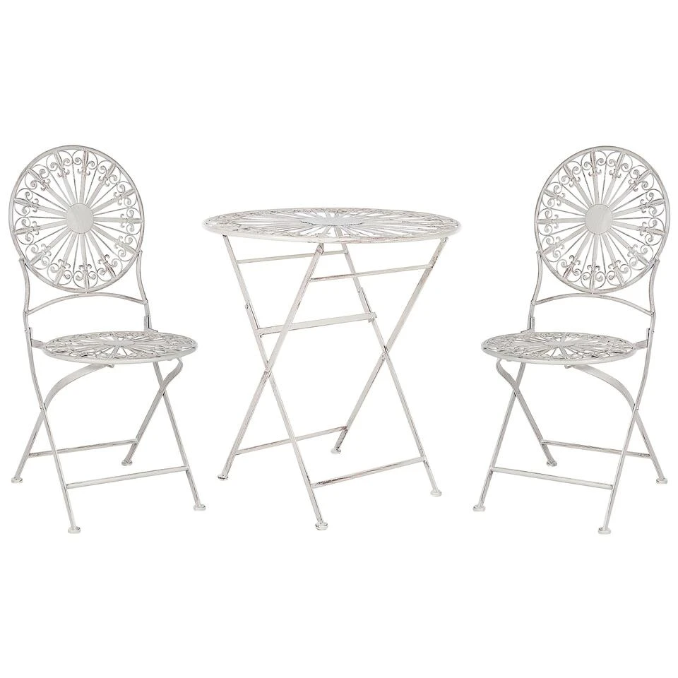 Balkonset met distressed effect. Creëer een buitenruimte in Franse stijl met deze prachtige balkonset. De set bestaat uit een ronde tafel en twee stoelen die gedecoreerd zijn met een verweerd effect voor een vintage sfeer. Naast de charmante look van de set is deze ook inklapbaar waardoor je gemakkelijk ruimte bespaart en de stukken gemakkelijk kan verplaatsen. Of je nu wilt eten met je geliefde of in de ochtend wilt genieten van een kopje koffie in de buiten lucht, deze set is de perfecte keus.