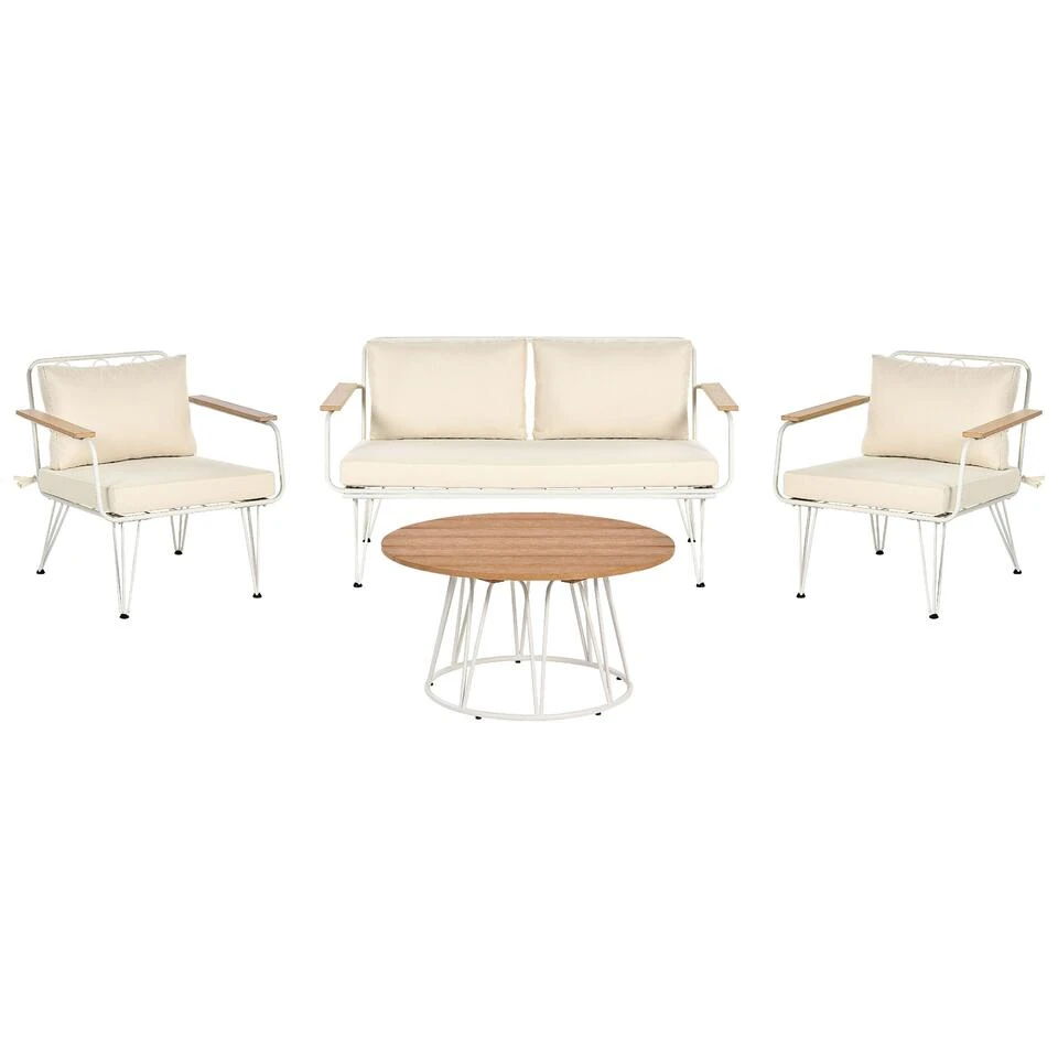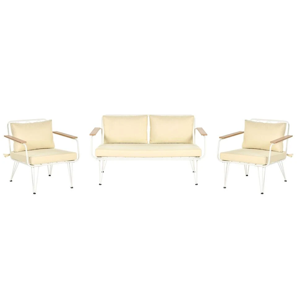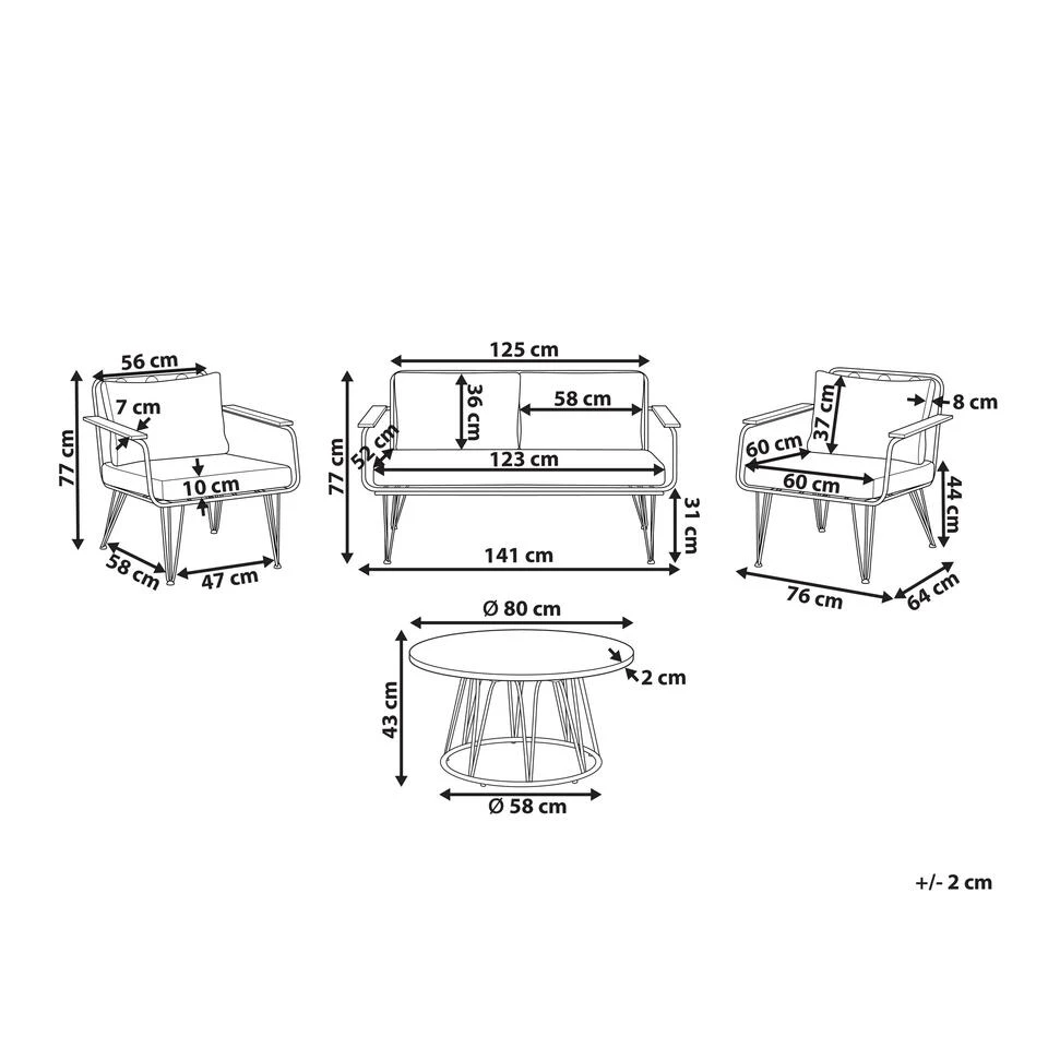 Tuinbank met fauteuils tuinset. Ervaar ontspanning en stijl in de buitenlucht met deze uitstekende tuinset. Het bestaat uit een 2-zitsbank, en twee uitnodigende fauteuils met een elegante salontafel. Ze zijn gemaakt met een robuust stalen frame, wat zorgt voor ongeëvenaarde stabiliteit en weerbestendigheid. Het tafelblad en de armleuningen zijn voorzien van een houtachtige afwerking, wat een charmante natuurlijke uitstraling geeft en een rustieke touch toevoegt. De meegeleverde zit- en rugkussens garanderen niet alleen een hoog comfort, maar zijn ook eenvoudig te onderhouden dankzij de ritssluitingen.