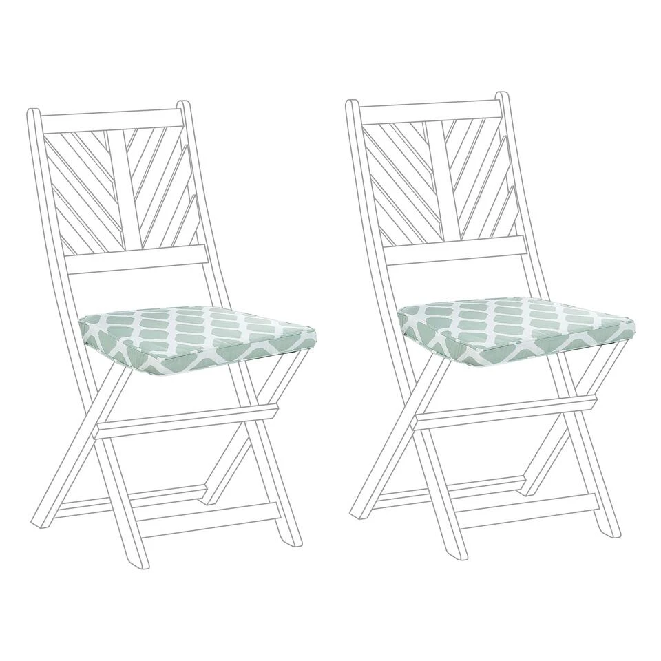 Set gewatteerde buitenkussens. Geen tuinmeubel is compleet zonder een zitkussen dat voor extra comfort zorgt. Deze set met geometrisch ruitpatroon voor een tuinstoel is voorzien van een dikke vulling voor comfortabel zitten. Met de banden kun je de onderdelen eenvoudig aan het frame van de stoelen bevestigen. Het opvallende patroon in een subtiele muntkleur brengt zomerse charme in elke buitenruimte.