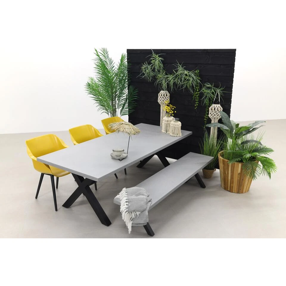 De Verona tuintafel heeft een strak design en is volledig gemaakt van aluminium. De unieke X-poten zijn afgewerkt met een mat zwart kleurige coating welke kras- en stootvast is. Onder de tafelpoten zit een verstelbaar dopje zodat je de tuinbank stabiel af kunt stellen. Aluminium wordt veel gebruikt in de tuinmeubelindustrie en heeft dan ook vele voordelen. Zo is dit materiaal licht in gewicht, kan het niet verroesten en gaat het jarenlang mee. Het tafelblad heeft een unieke betonlook en combineert perfect bij het mat zwarte frame. Dankzij de speciale coating op het tafelblad klinkt het blad niet metaalachtig als je er op tikt. De tuintafel heeft een lengte van 220 cm. en een breedte van 100 cm. Voldoende ruimte dus om met 6 personen aan te schuiven.