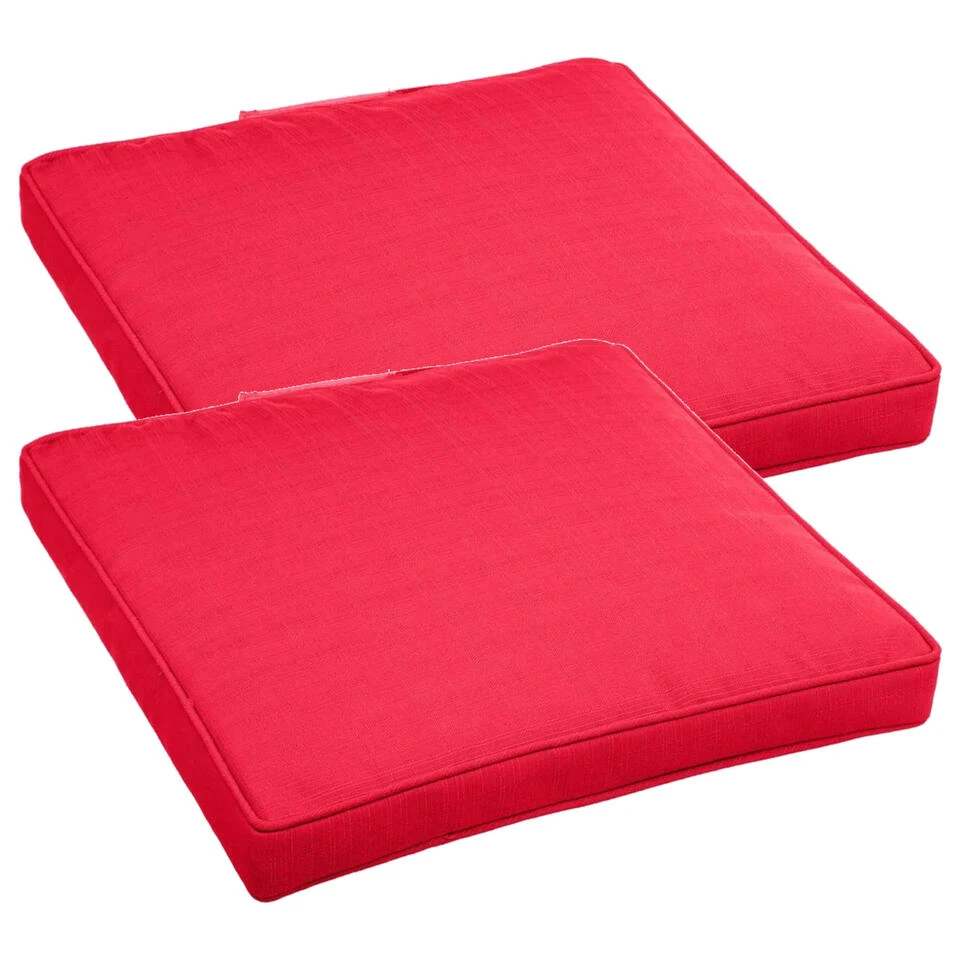 Stoelkussens voor binnen en buiten/tuin stoelen in de kleur rood 40 x 40 x 4 cm. Makkelijk vast te maken met aangehechte klittebandsluiting. Deze mooie kussens zijn water en UV-bestendig. Materiaal: 100% polyester. Wasbaar: ja, de hoes is wasbaar op 30 graden. Buitenkussens voor bij uw tuinstel. Diverse mooie luxe kleuren voor een topprijs. Tuinkussens voor buitenstoelen.