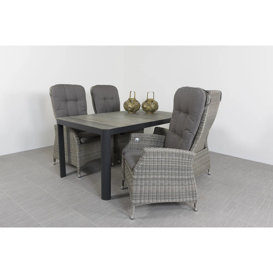 Genieten van een heerlijk diner of een gezellig lunch? Aan de Memphis/Queens tuinset is het allemaal mogelijk. Je kan na het eten zelfs heerlijk uitbuiken in ligstand. Wat wil je nog meer? De tuinset bestaat uit 4 Memphis verstelbare tuinstoelen en 1 Queens tuintafel. Met de afmetingen van 160 x 90 cm. biedt de tafel ruimte aan 4 personen. Je kan er ook voor kiezen om een extra stoel aan de kopse kanten van de tuintafel te plaatsen zodat er ruimte is voor 6 personen.
