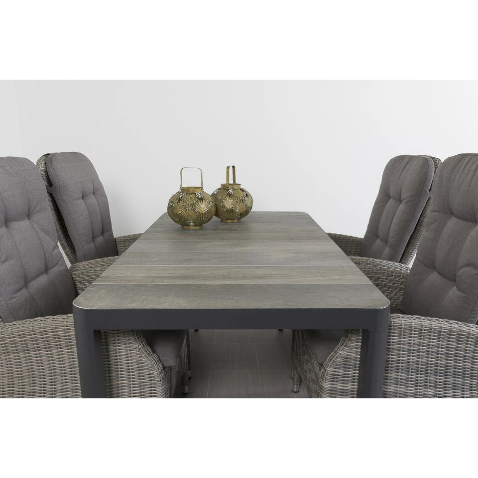 De Queens tuintafel heeft een stevige onderstel van aluminium welke afgewerkt is met een antracietkleurige coating. Het tafelblad is gemaakt van keramiek, dit is een harde steensoort en dus perfect geschikt als tafelblad. Keramiek heeft weinig onderhoud nodig en is bestand tegen diverse weersinvloeden. Het keramiek heeft een print in houtlook waardoor de tuintafel een stoere uitstraling krijgt.