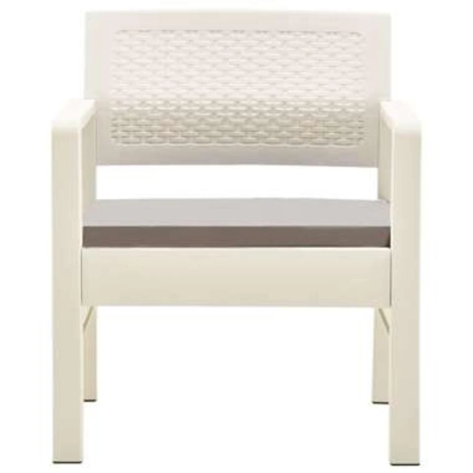 De levering bevat: 1 tafel, 2 armstoelen en 2 zitkussens.